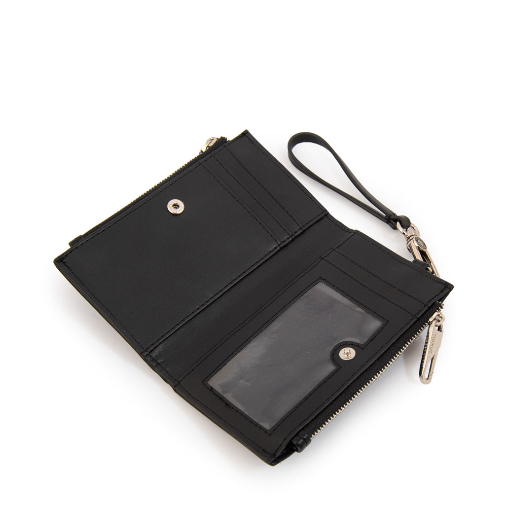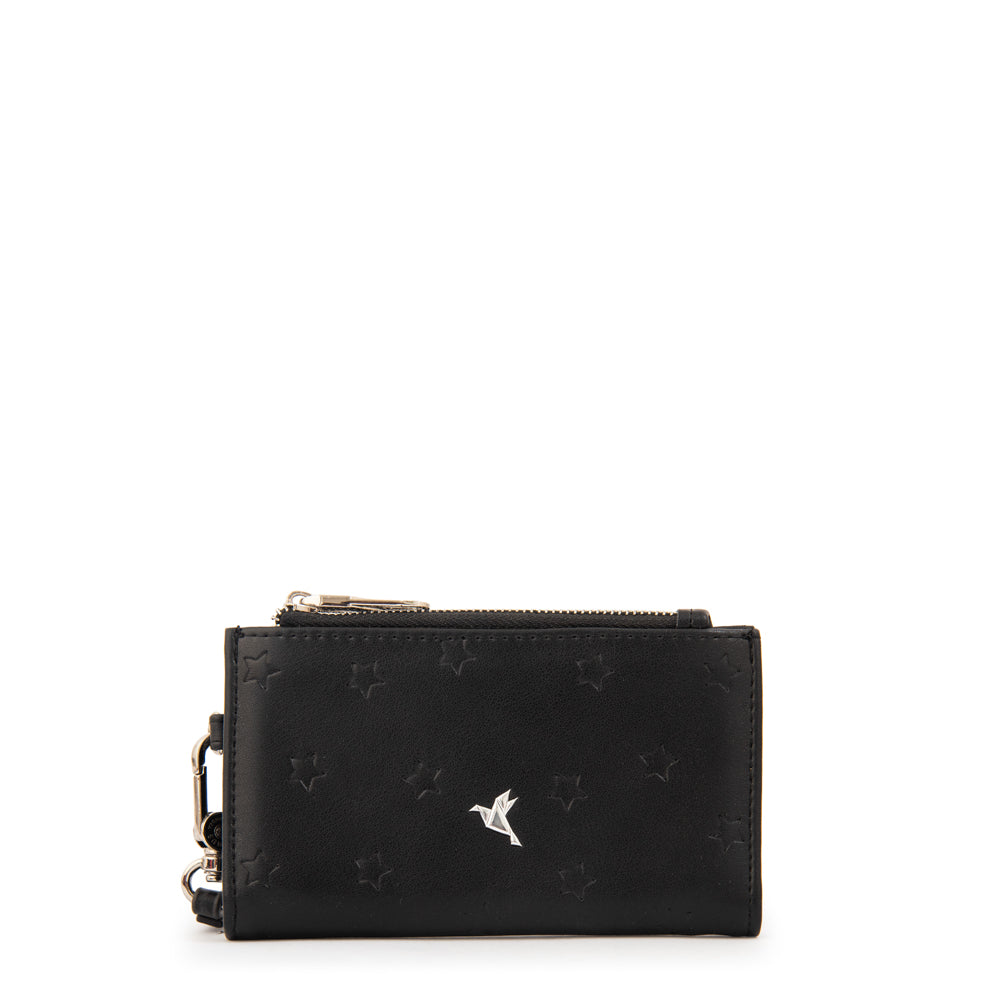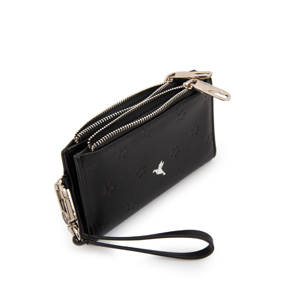 For everyday! El monedero Kael en color negro es muy funcional. Confeccionado en PU, este modelo de Trinus en formato rectangular, es resistente y presenta un diseño minimalista con un delicado estampado de pequeñas estrellas que le aportan un toque cool. Cuenta con cierre seguro y un pequeño strap en silver, ideal para llevarlo colgando en el bolso. Kael, you are the one!