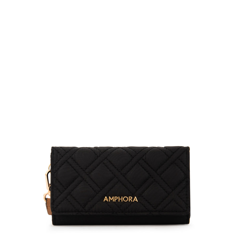 More than a wallet, a statement. La billetera Gambia negra destaca por su diseño práctico y seguro. Confeccionada en nylon con cierre de broche y colgante, es ideal para llevar tarjetas y billetes con estilo.