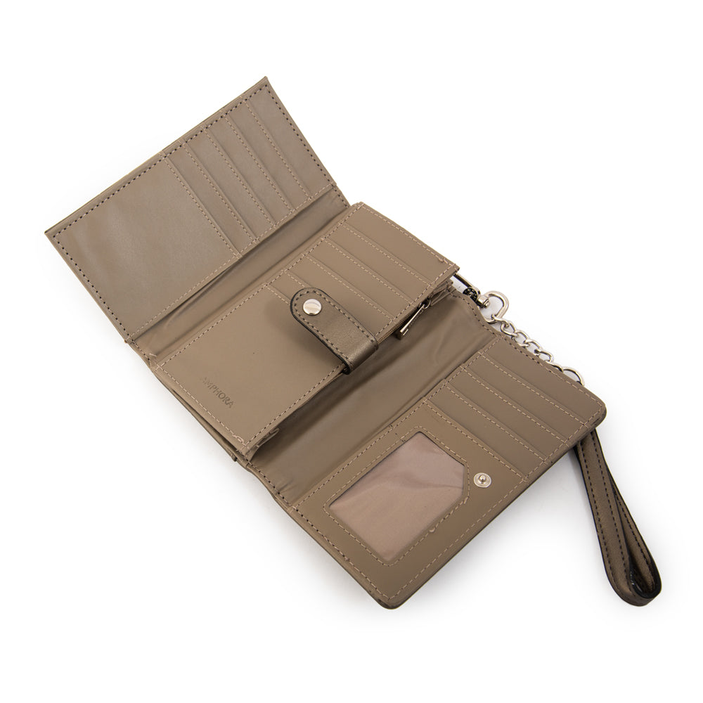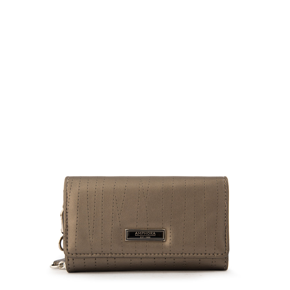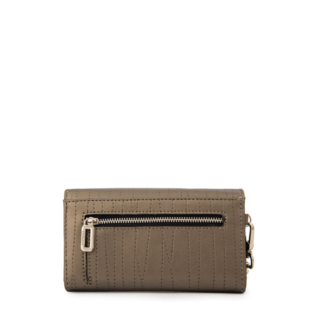 Metallic chic! La billetera mediana Guinea en plateado oscuro es el accesorio que equilibra funcionalidad y tendencia. Con su acabado en ecocuero liso y herrajes en niquelado, su diseño con broche permite llevar todo seguro sin perder sofisticación. Shiny & organized!