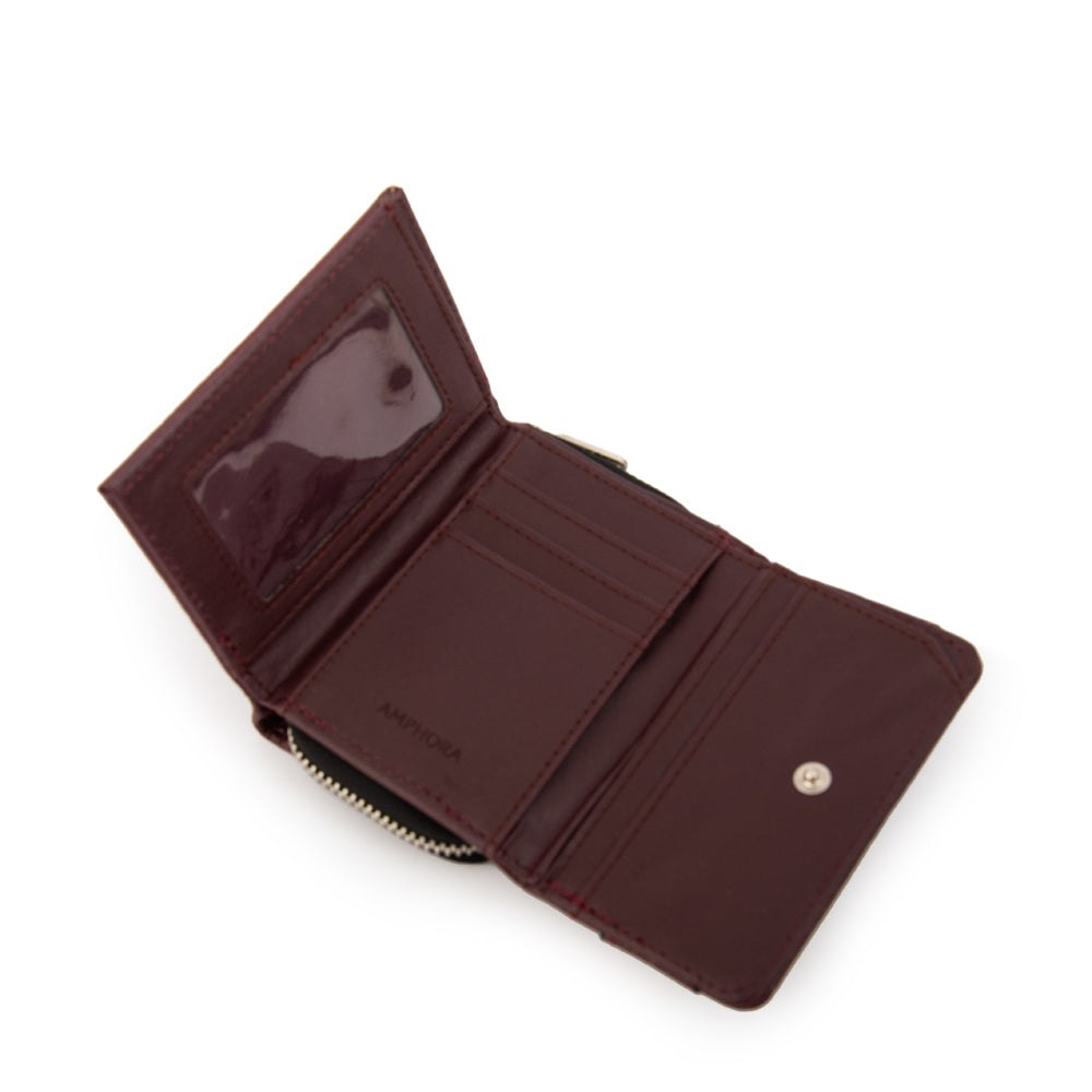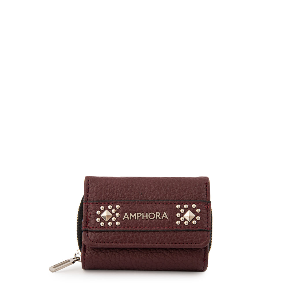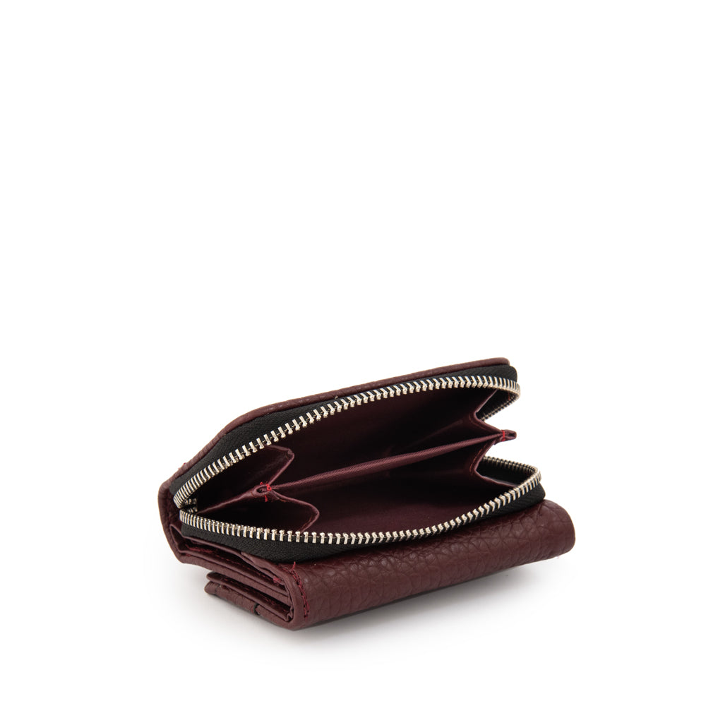 Deep & daring! La billetera pequeña Bissau en burdeo destaca por su tono vibrante y diseño funcional. Confeccionada en ecocuero graneado con herrajes en niquelado, su cierre con broche garantiza seguridad con un extra de personalidad. Own the look!