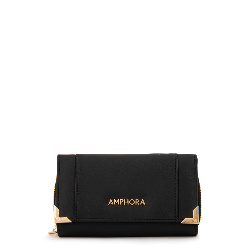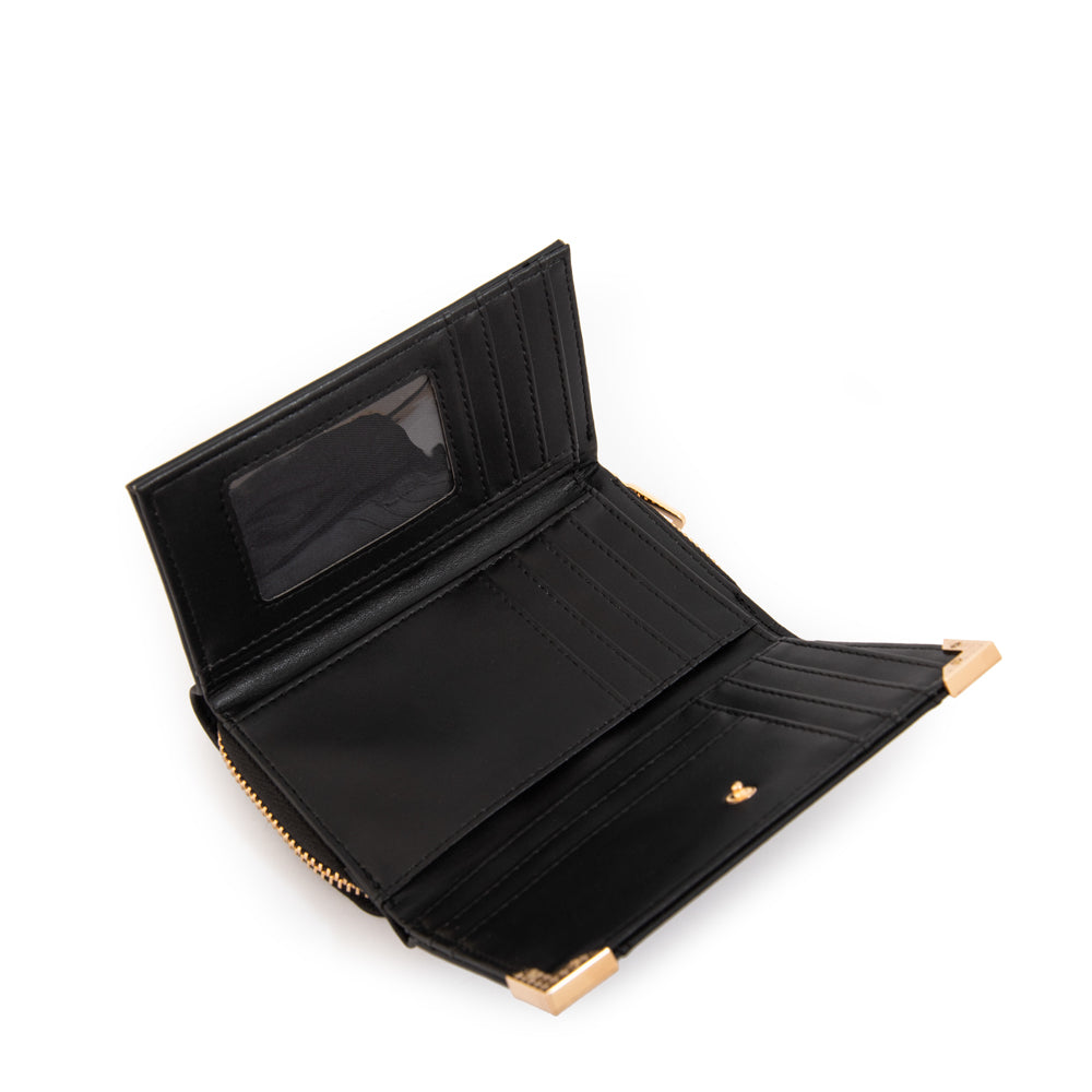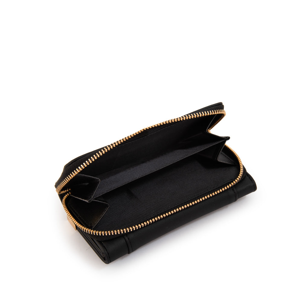 Compact & classic! La billetera pequeña Corcega en negro es ideal para quienes buscan practicidad en un formato reducido. Su diseño en ecocuero liso con broche y herrajes dorado claro permite llevar tus esenciales con comodidad y elegancia. Simplicity at its best!