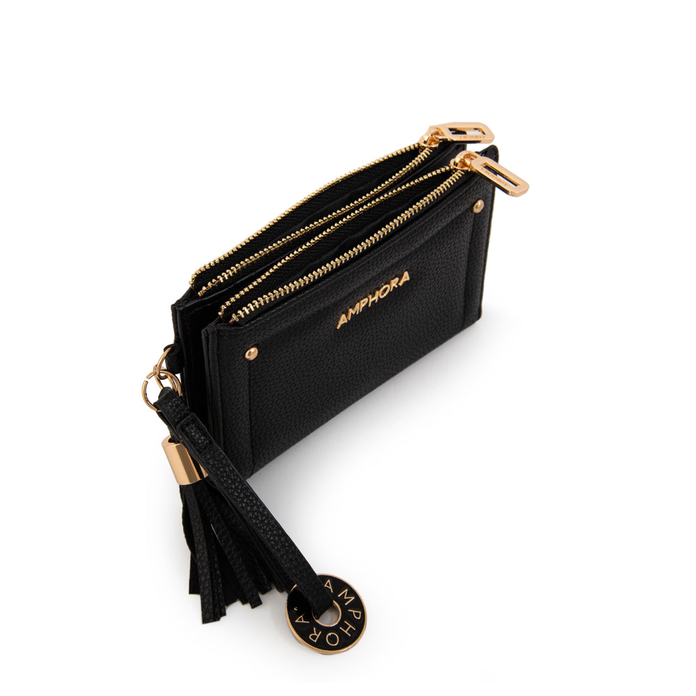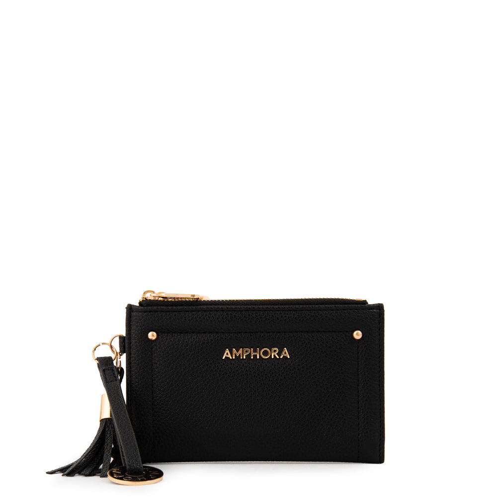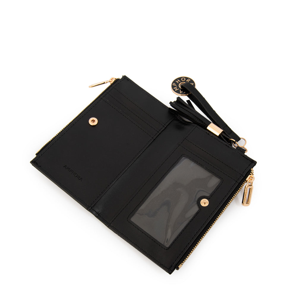 Compact but full of style. La billetera Etiopía negra en tamaño pequeño es ideal para llevar lo justo sin perder elegancia. Su borla decorativa y su cierre práctico la hacen funcional y versátil.