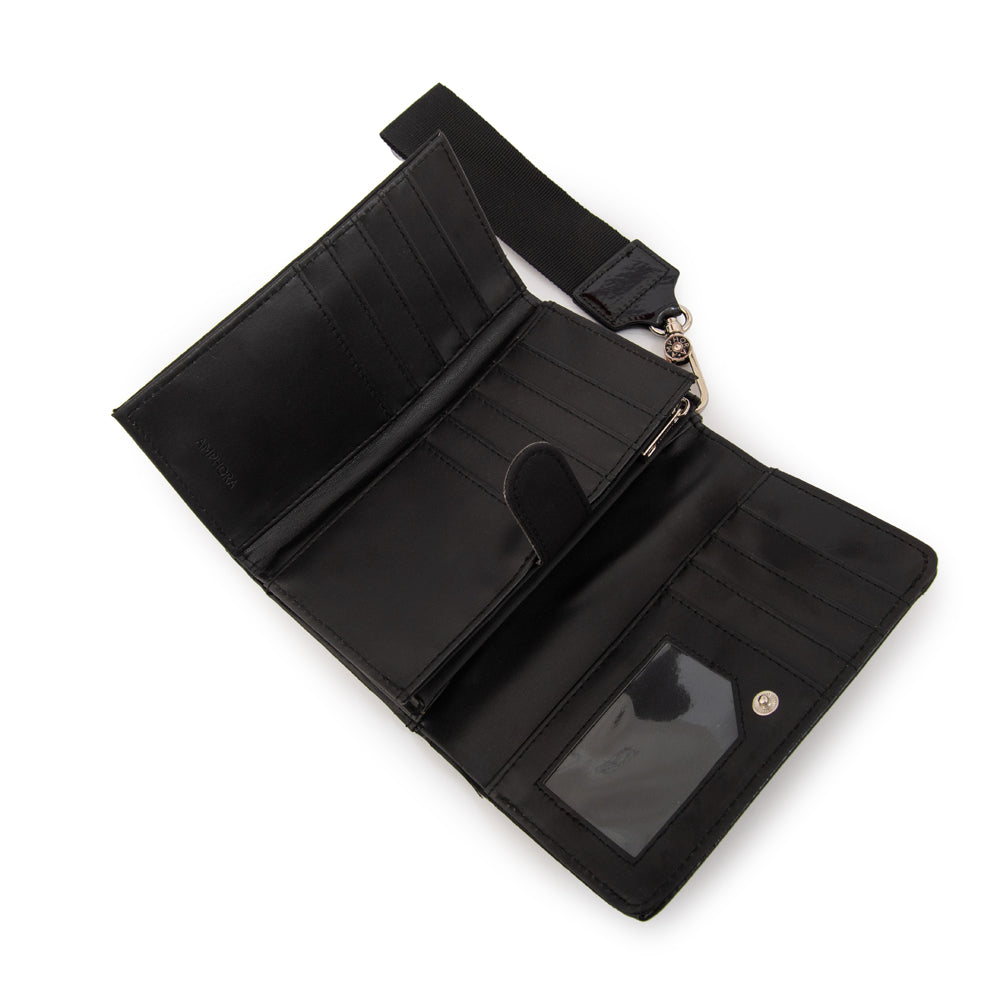More space, same style! La billetera mediana Carina en negro es la alternativa perfecta para quienes necesitan un poco más de capacidad sin perder comodidad. Fabricada en nylon con herrajes en niquelado, su tamaño de 10 cm de alto y 16 cm de ancho permite organizar billetes y tarjetas con facilidad. Su broche y colgante aseguran un uso práctico y seguro. Sleek & functional!