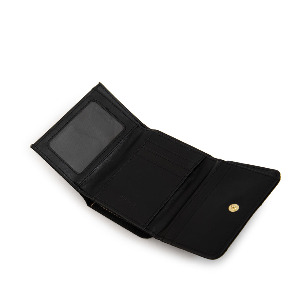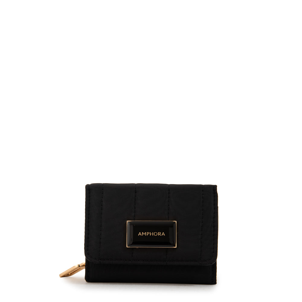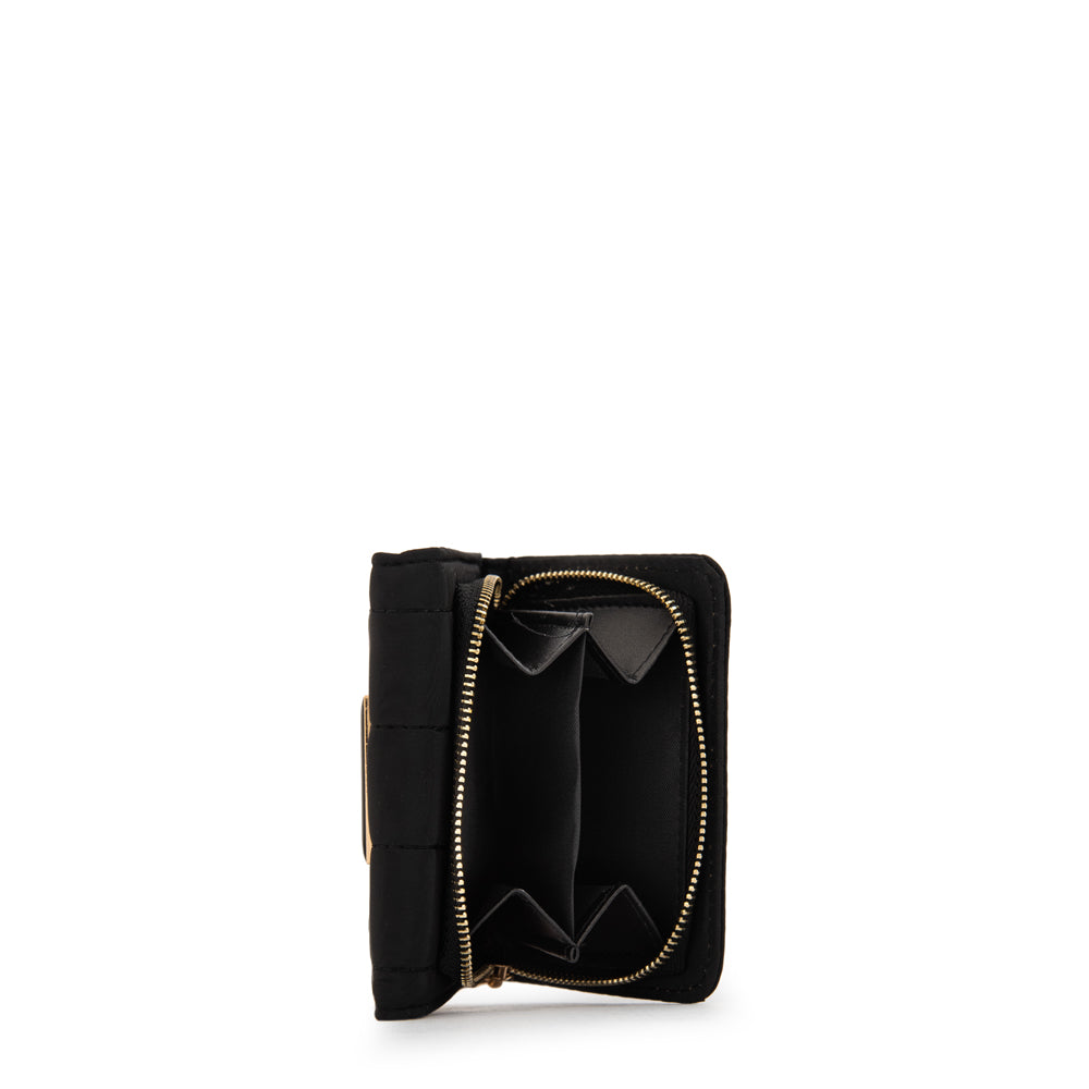 Classic & functional! La billetera pequeña Japón en negro es la combinación perfecta de estilo y utilidad. Hecha en nylon con herrajes en dorado claro, su diseño compacto de 10 cm de alto y 12 cm de ancho permite guardar billetes, tarjetas y más de manera segura gracias a su broche de cierre. Elegance in a small package!