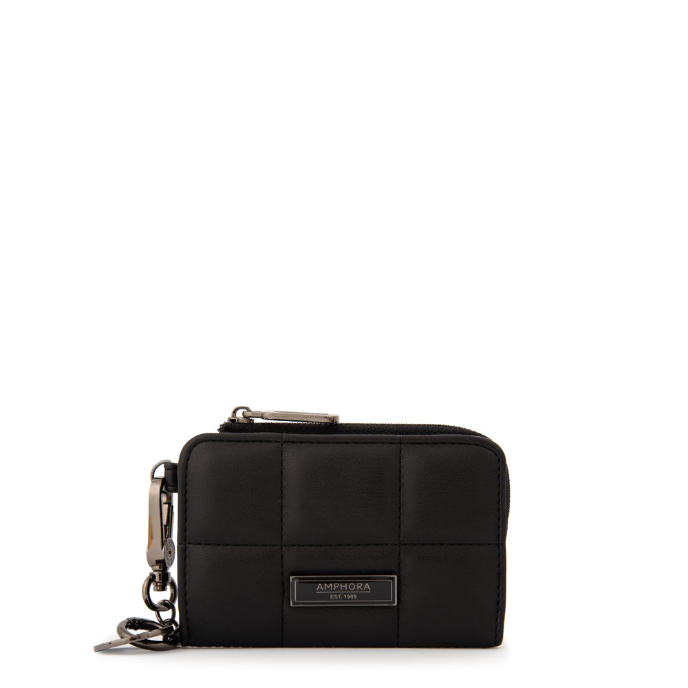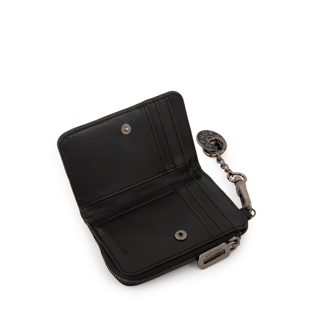 Sleek & modern! La billetera pequeña Vania en negro es ideal para quienes buscan un accesorio funcional sin perder elegancia. Fabricada en ecocuero liso con colgante de cadena y detalles en grafito, cuenta con un cierre seguro y dimensiones de 10 cm de alto y 12 cm de ancho para guardar tarjetas, billetes y más. Compact, practical & stylish!