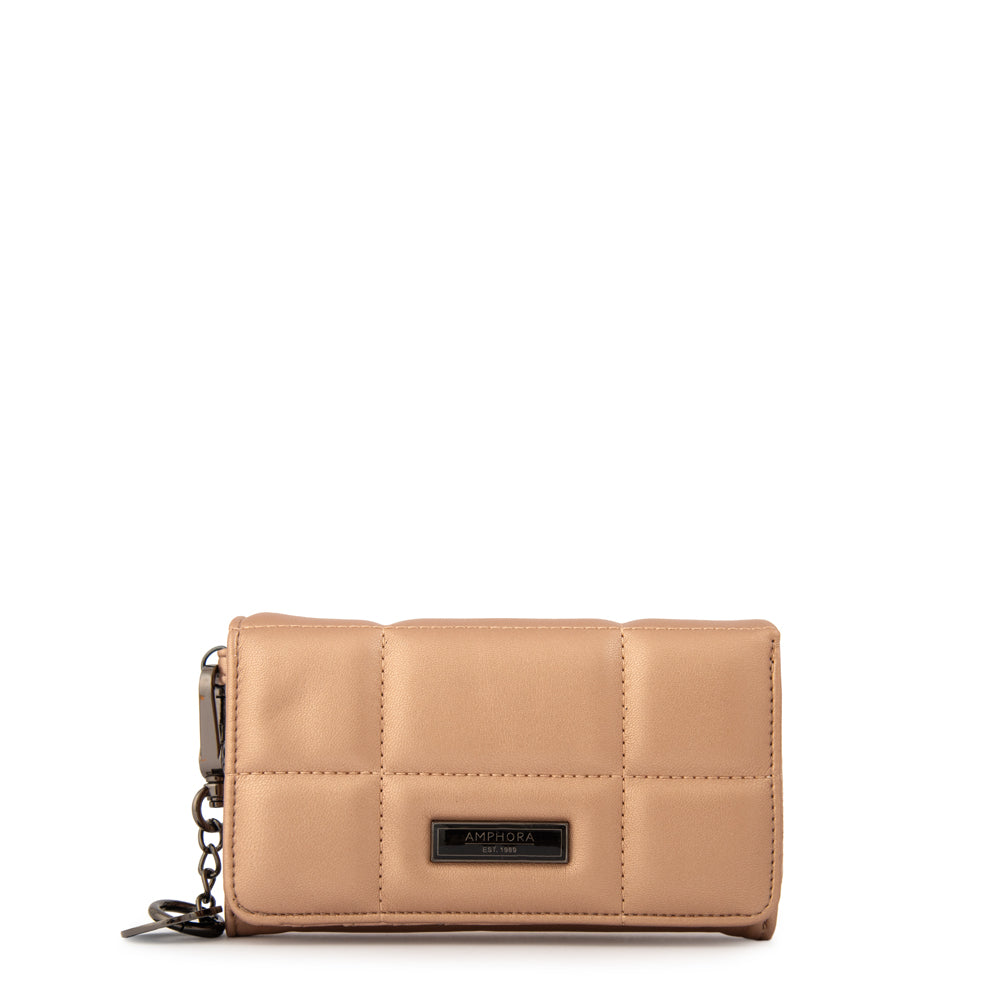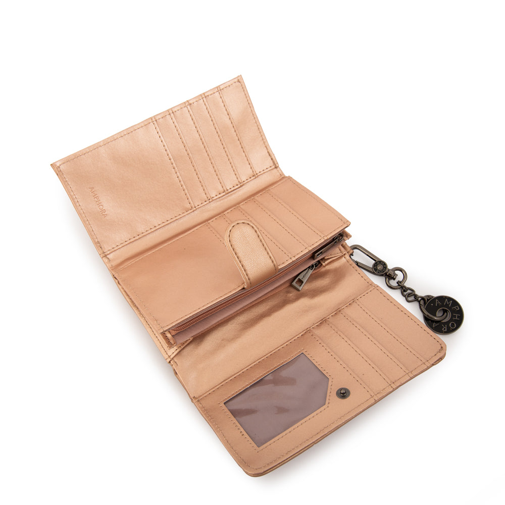 Shiny & trendy! La billetera Vania en rosa metálico es un must para quienes aman los detalles con brillo. Confeccionada en ecocuero liso con colgante de cadena y broche en grafito, su tamaño de 10 cm de alto y 16 cm de ancho ofrece el espacio perfecto para organizar todo con estilo. Glamour on the go!