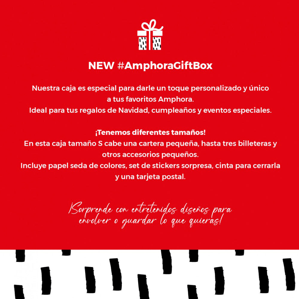 NEW #AmphoraGiftBox Nuestra caja es especial para darle un toque personalizado y único a tus favoritos Amphora. Ideal para tus regalos de Navidad, cumpleaños y eventos especiales. ¡Tenemos diferentes tamaños! En esta caja tamaño S cabe una cartera pequeña, hasta tres billeteras y entre otros accesorios. Incluye papel seda de colores, set de stickers sorpresa, cinta para cerrarla y una tarjeta postal. ¡Sorprende con entretenidos diseños para envolver o guardar lo que quieras!
