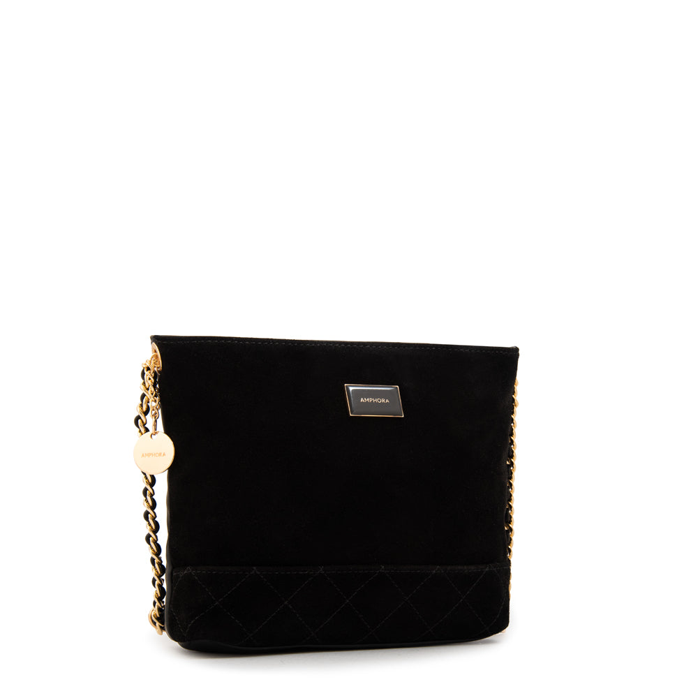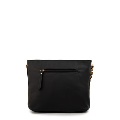 More space, same elegance! La Judy en negro llega en su versión mediana para quienes buscan un poco más de espacio sin perder la esencia minimalista. Con 22 cm de alto y 28 cm de ancho, está confeccionada en ecocuero liso con herrajes en broce envejecido, asegurando un look clásico con un giro moderno. Su cierre seguro protege tus esenciales y su correa ajustable te permite llevarla cómodamente. Perfecta para cualquier ocasión!