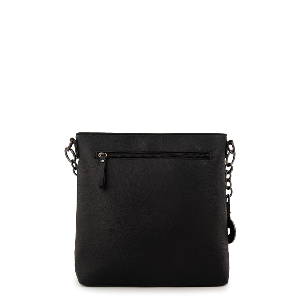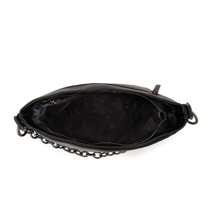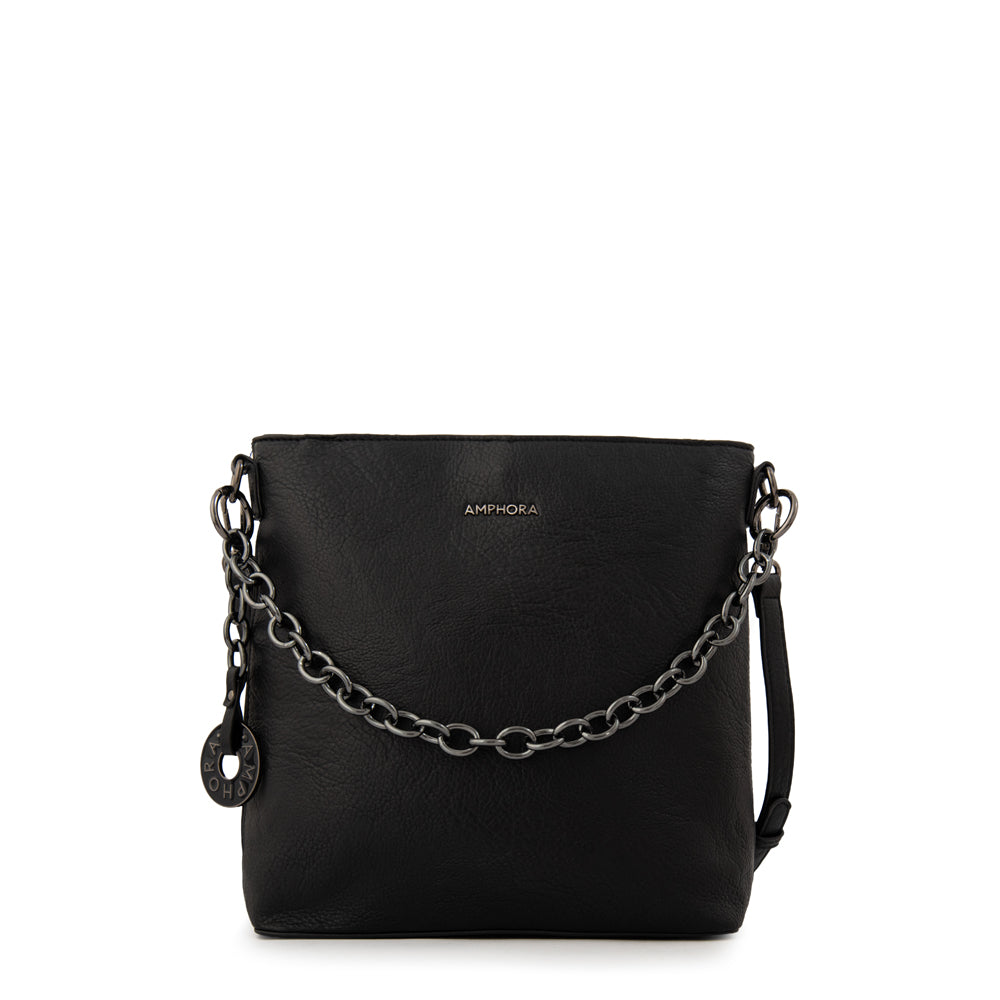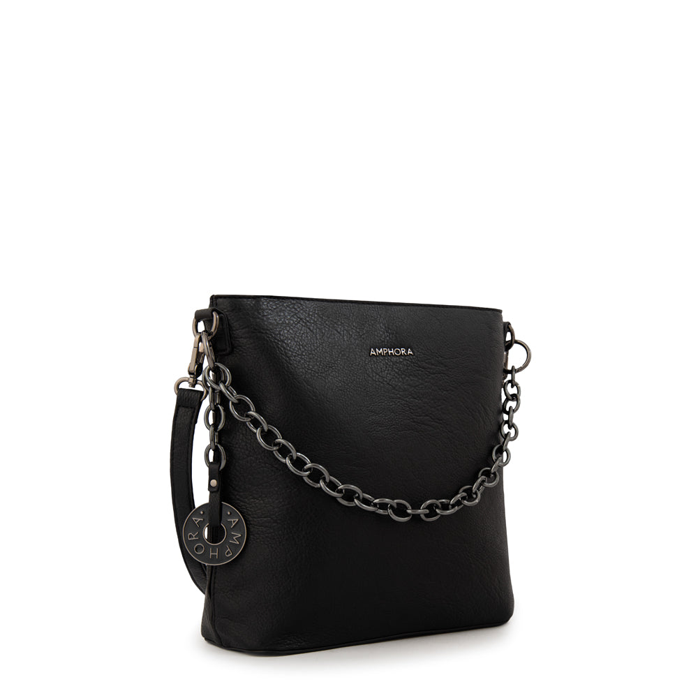 #Viena waits for you. Una bandolera negra que define tu estilo. Confeccionada en cuerina texturizada, esta cartera es un must-have atemporal. Su diseño clásico se actualiza con un toque chic: un colgante de cadena que añade un brillo sutil. La correa ajustable ofrece versatilidad para llevarla cruzada o al hombro. Además, sus múltiples bolsillos (1 exterior y 3 interiores) te permiten organizar tus esenciales con facilidad. Si buscas Carteras Amphora stylish, #Viena te espera para este Invierno 2025.