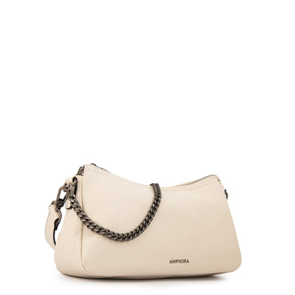 Fresh, clean & effortlessly stylish. La Bonnie by Amphora en blanco crudo es la definición de minimalismo con impacto. Con su diseño en ecocuero texturizado, detalles en cadena y estructura de corte oval, es una pieza que complementa cualquier outfit sin esfuerzo. Su tamaño de 31 cm de ancho y 15 cm de alto te da el espacio ideal para llevar lo que necesitas, asegurado con su práctico cierre. Light, bright & just right!