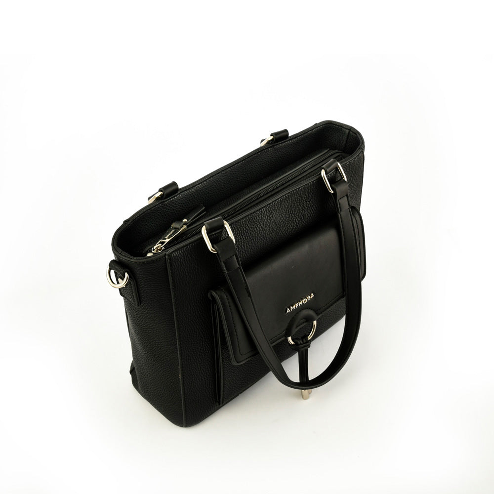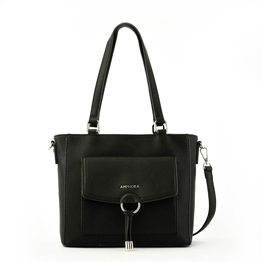 Nuestra dos asas Antalya de tamaño mediano está pensada en una paleta de colores clásica, ideal para combinar con tus outfits más ejecutivos. Realizada de PU graneado negro, además de las dos asas, tiene correa regulable para ajustarla a tu medida, un bolsillo exterior con cierre y broche magnético y tres bolsillos interiores (uno con cierre). La argolla le aporta un fashion edge pensada para que sea esa cartera que nunca falla.