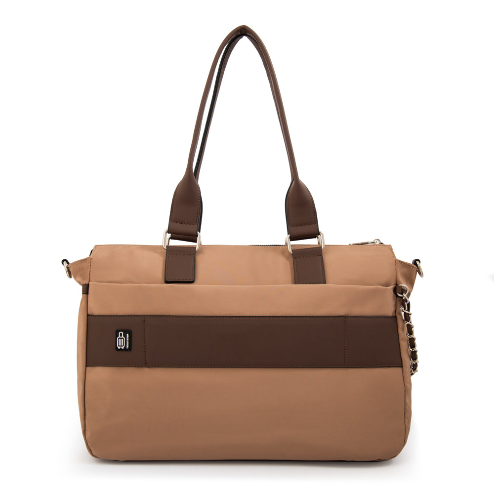In my girl boss era con #Gambia. Esta cartera beige oscuro para notebook, confeccionada en nylon negro, es para quienes buscan algo práctico y ondero en un solo accesorio. Su diseño sport casual, con un toque trendy gracias al hanging cordón, te invita a explorar nuevas facetas de tu día a día. Más que un bolso, #Gambia es una compañera que te impulsa a atreverte. Incluye un compartimento para notebook de 13", 3 bolsillos internos y 2 externos para que tengas todo organizado. La correa ajustable y las dos asas cortas ofrecen versatilidad para llevarla como prefieras.