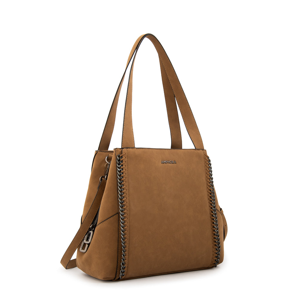 Classic & cool, all in one. La Maya en café tiene todo lo que necesitas en una cartera. Su diseño de doble asa en ecocuero con textura, tres divisiones internas y cierre seguro hacen que sea tan práctica como estilosa. Con 28 cm de alto y 37 cm de ancho, es ideal para llevar todo sin sacrificar comodidad. Un esencial atemporal que te acompaña siempre.
