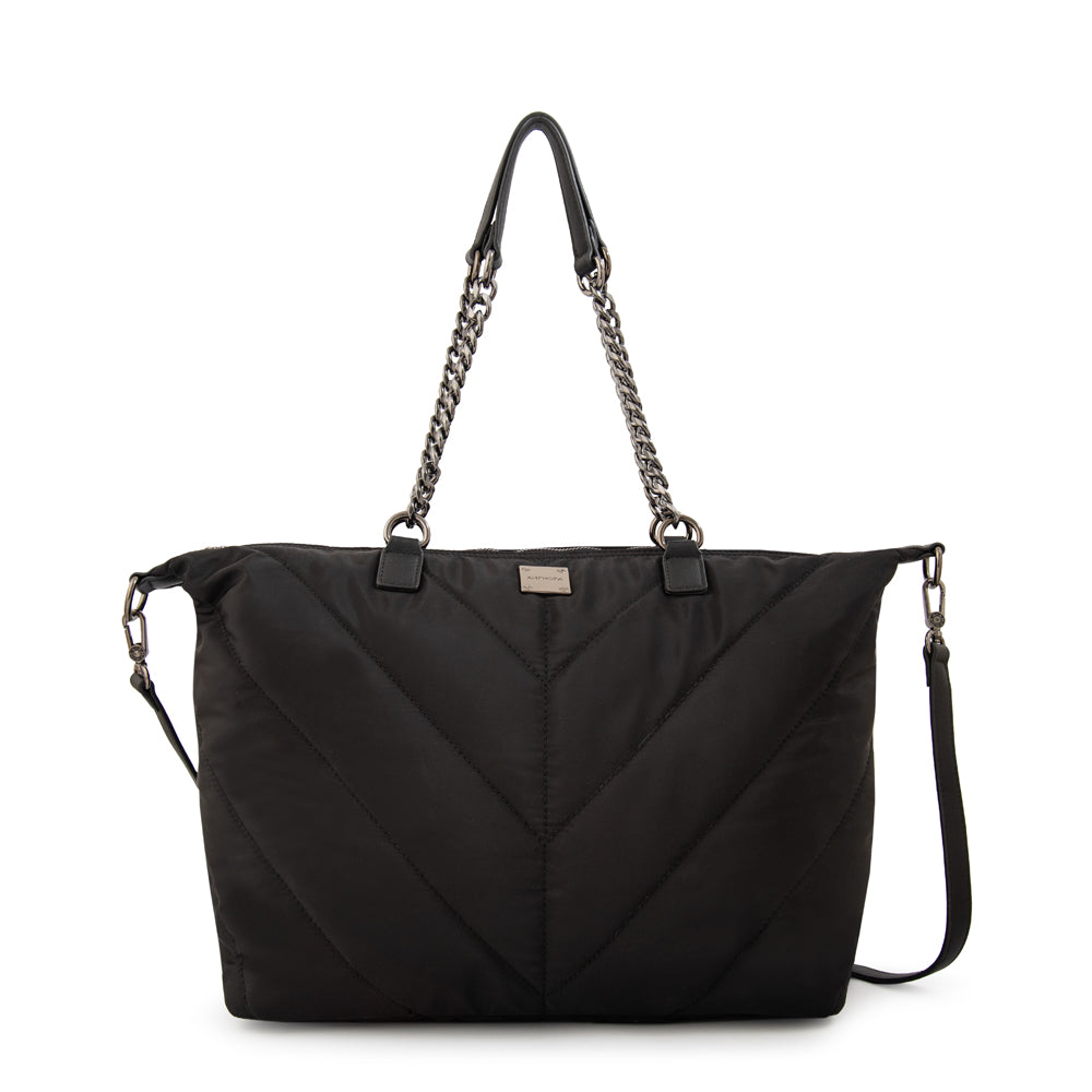 Elegancia ante todo. Conoce la cartera de dos asas Onix de Amphora, en color negro el modelo perfecto para acompañarte en tus días de oficina. Su espacio inteligentemente diseñado incluso permite llevar tu computador con comodidad. Confeccionada en nylon, cuenta con dos asas en cadena plateada y un strap a juego. Onix es un must-have para todos los días.