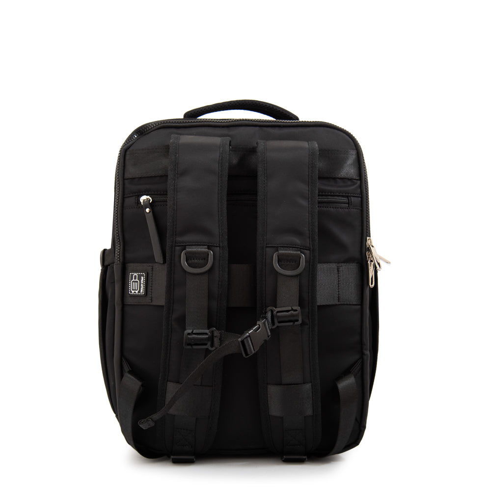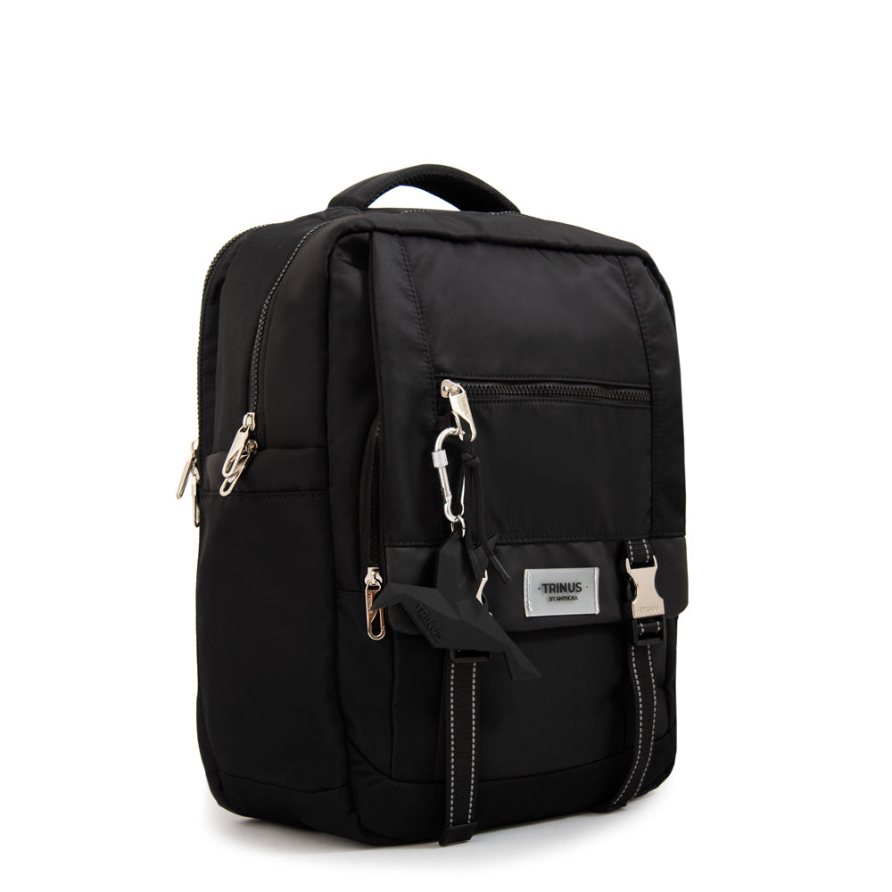 Move with style, go with ease. La mochila Dania en negro es ese essential que no puede faltar en tu rutina. Hecha de nylon resistente, su diseño grande y espacioso incluye tres bolsillos externos y tres internos, además de un compartimento especial para notebook de hasta 15”. Con cierre seguro y correas ajustables, es perfecta para viajar, moverte por la ciudad o simplemente llevar todo contigo con estilo. #Dania ¡Llévala y hazla tu favorita!.