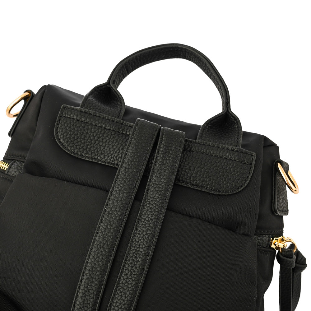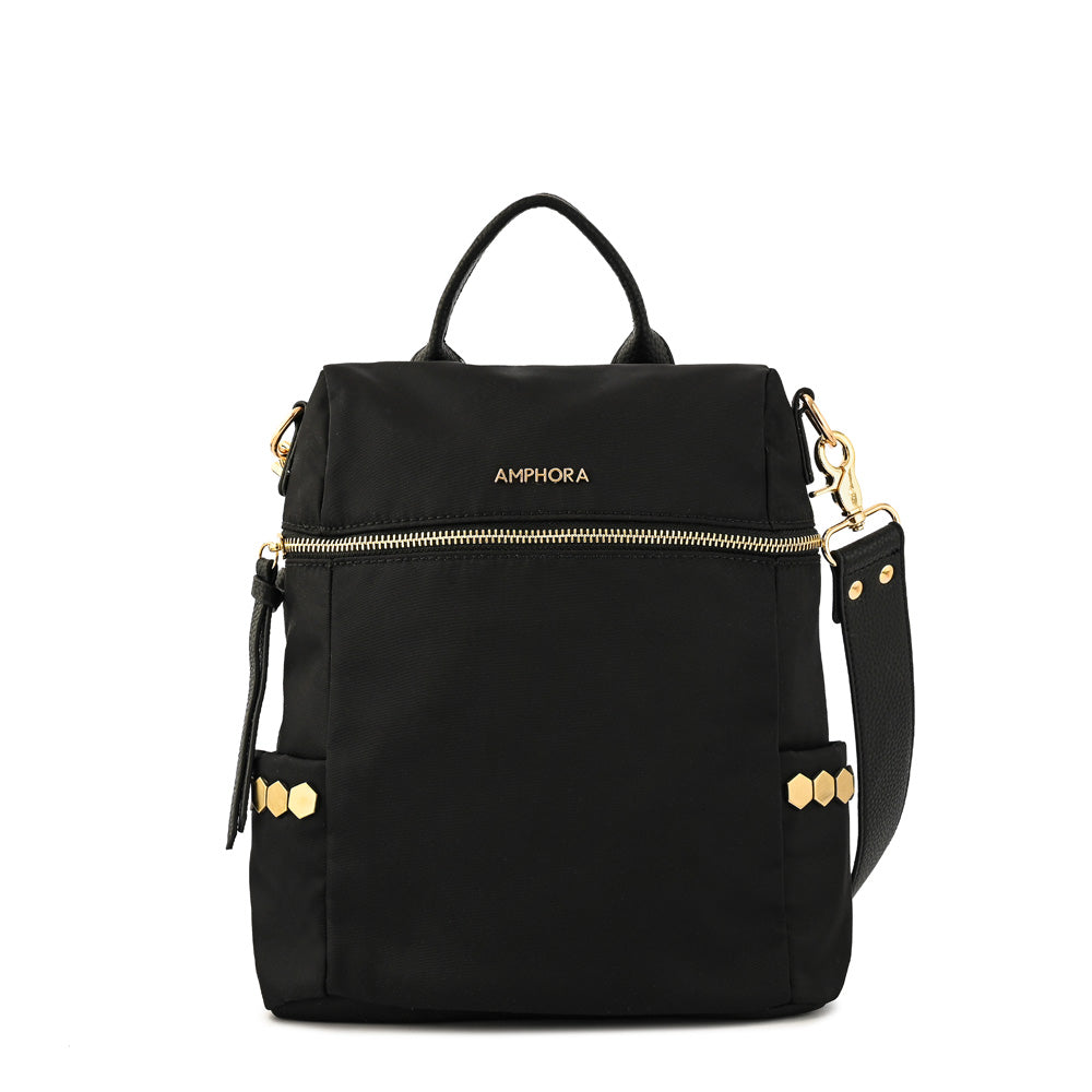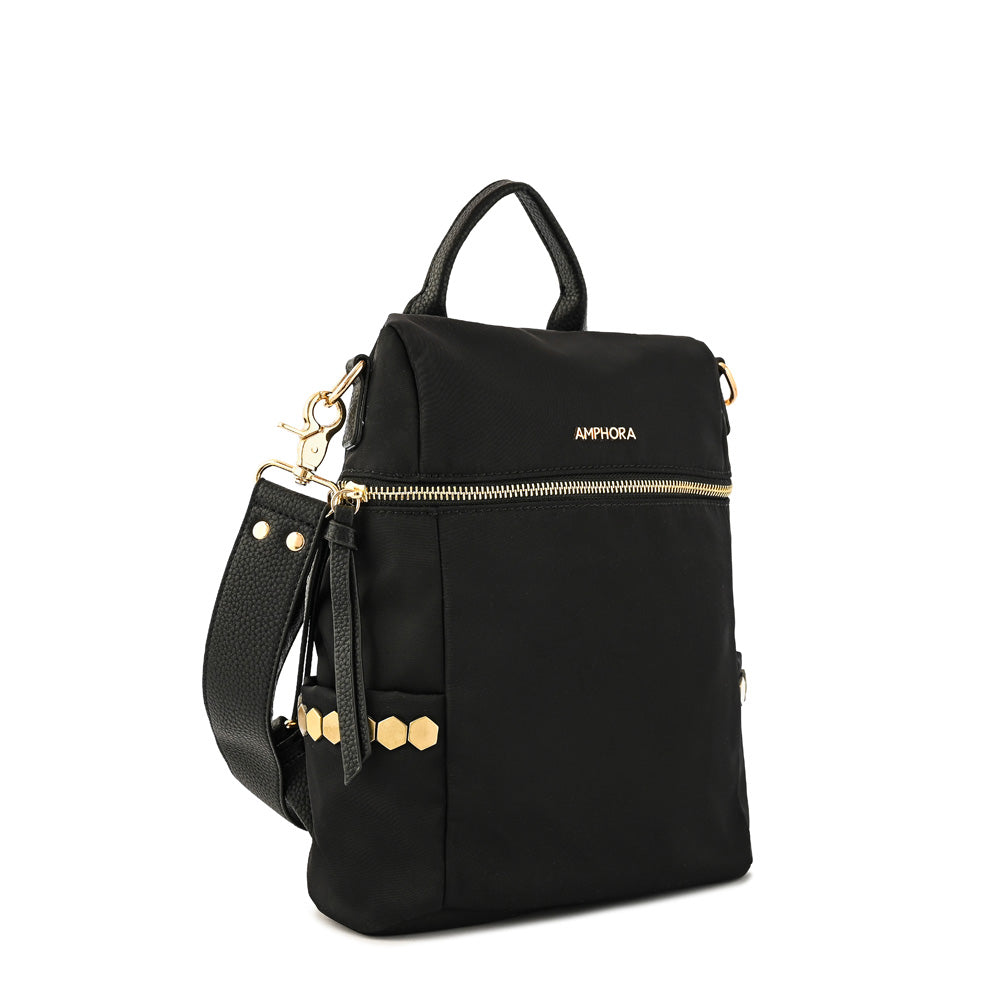 Dress for succes! La mochila #Teriosa en su versión mini, confeccionada en nylon negro, es la compañera para quienes buscan funcionalidad y comodidad en un solo accesorio. Con 10 litros de capacidad y múltiples bolsillos (1 exterior y 3 interiores), te permite llevar tus esenciales organizados y listos para cualquier plan. Su diseño sport casual se adapta a tu ritmo de vida, invitándote a explorar nuevos caminos. #Teriosa es esa bandolera Amphora que te anima a atreverte, a descubrir los detalles que te hacen única.