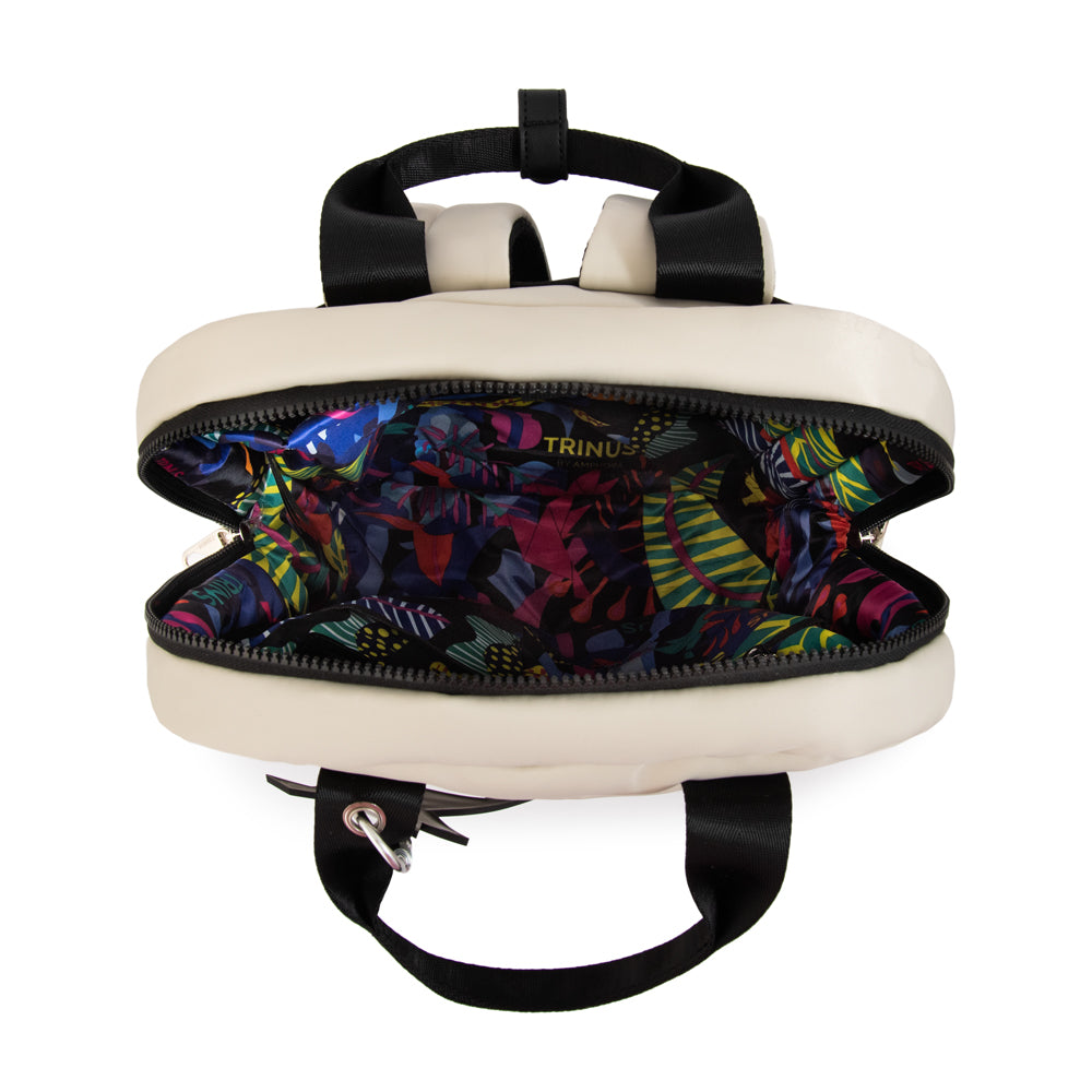 Take it anywhere, carry it all. La mochila Juliana en blanco crudo combina funcionalidad y estilo. Su diseño en nylon resistente tiene seis bolsillos externos y cuatro internos, además de un compartimento acolchado para notebook de hasta 15”. Con correas ajustables, cierre seguro y un colgante de goma, es el complemento ideal para un look urbano y práctico. #Juliana ¡Llévala y dale un upgrade a tu día!