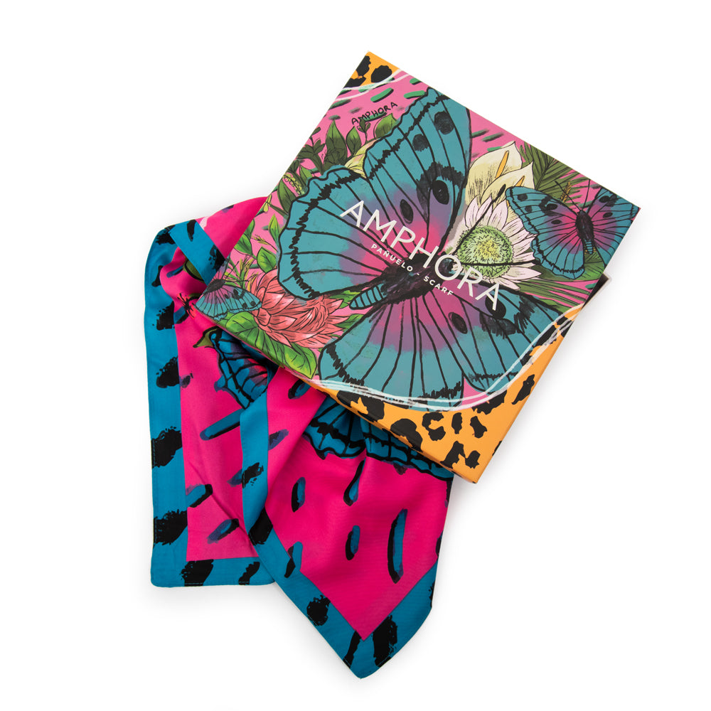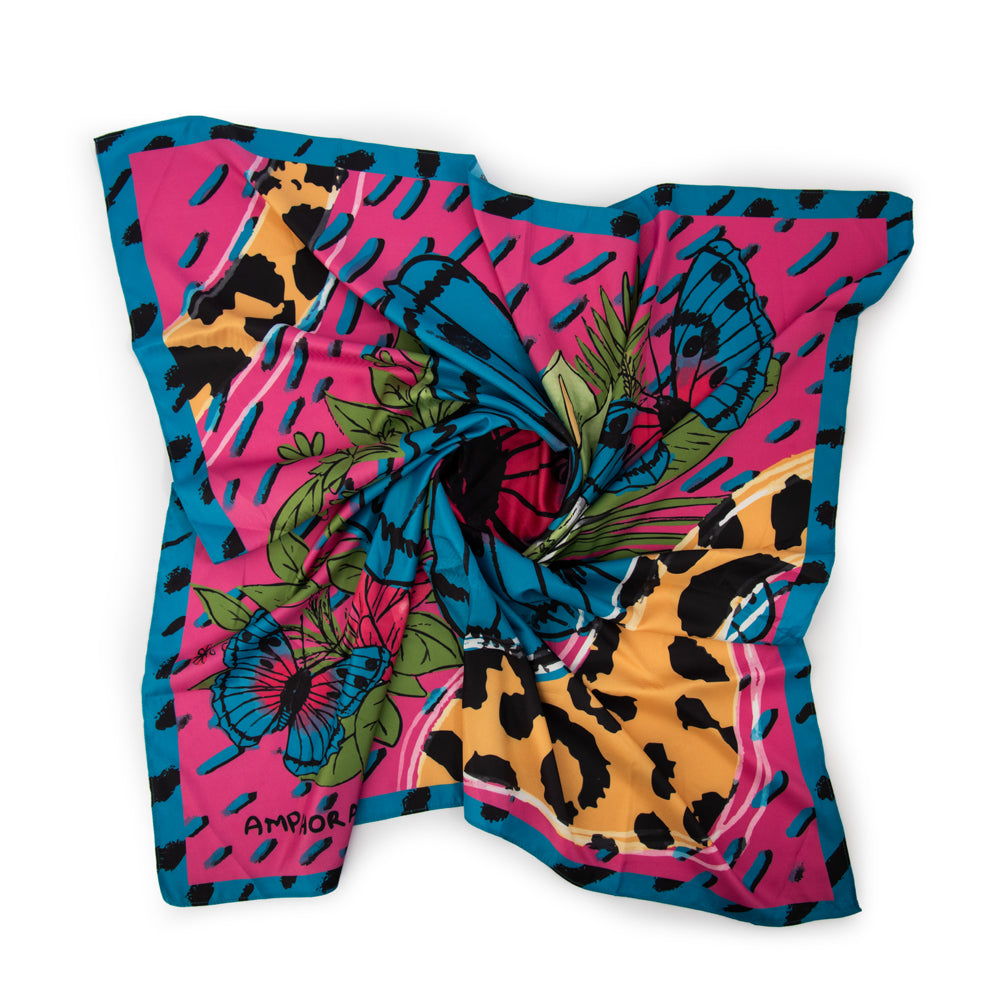 Luce color, estilo y abrigo con el pañuelo Auren. Diseñado con un vibrante animal print en tonos fucsia, turquesa y mostaza, este pañuelo de satín twill es ideal para dar personalidad a tus looks y protegerte en días frescos. Un accesorio imprescindible para destacar en cualquier ocasión.