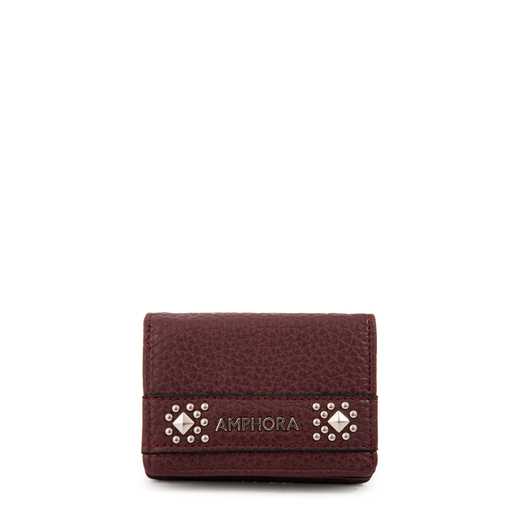 Bold & compact! El tarjetero Bissau en burdeo es un toque de color para quienes buscan un accesorio con personalidad. Su acabado en ecocuero graneado con herrajes en niquelado y su cierre con broche garantizan estilo y seguridad. Make a statement!