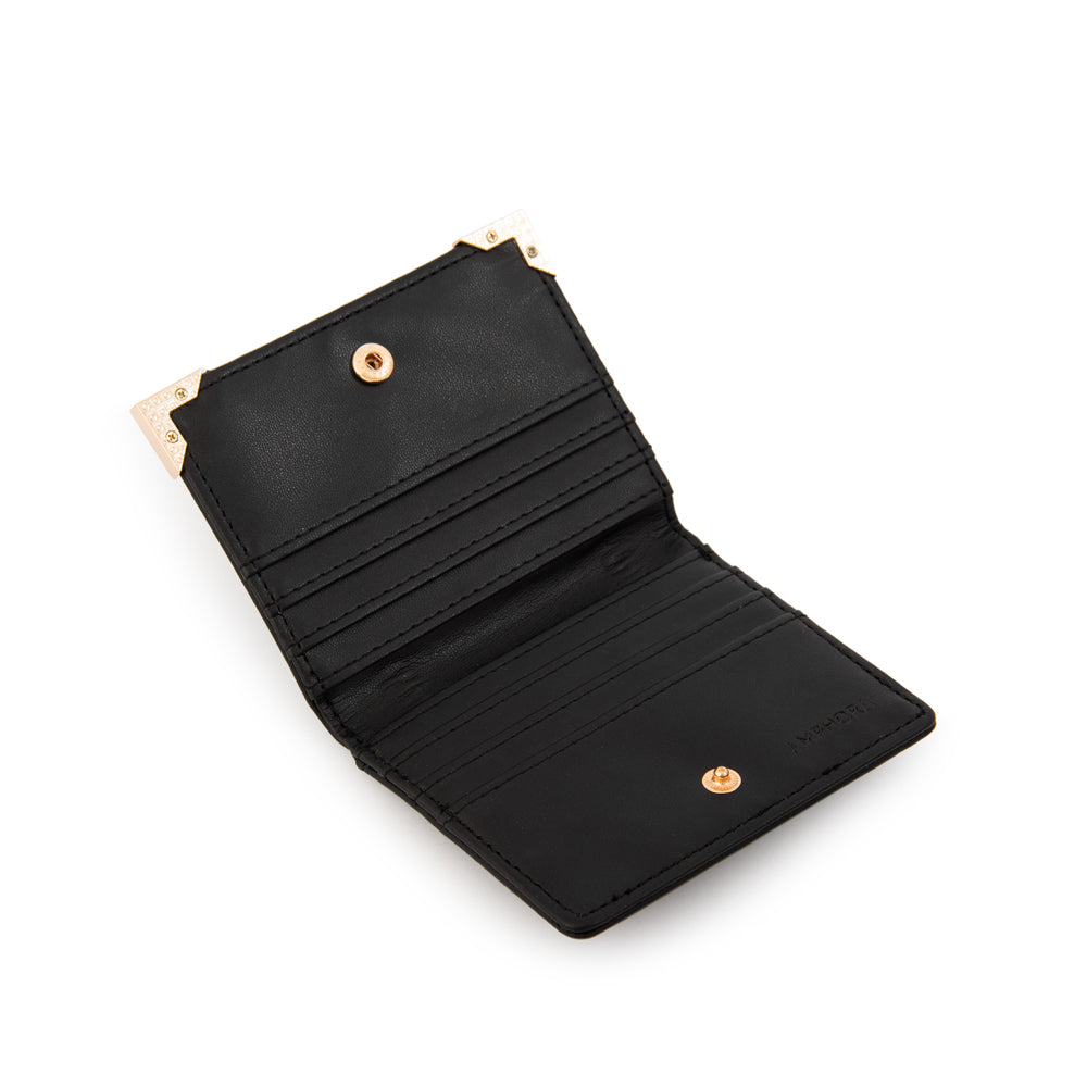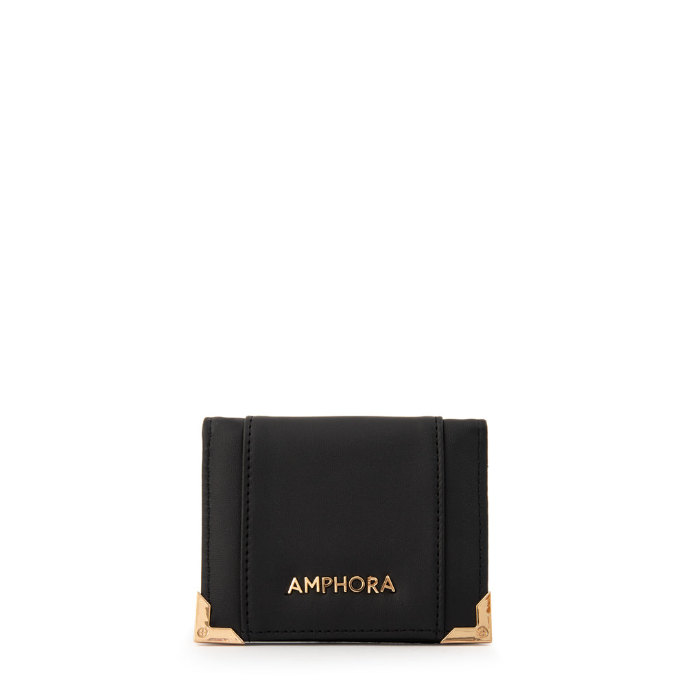 Smart & secure! El tarjetero Corcega en negro es el aliado perfecto para mantener tus tarjetas organizadas con un diseño compacto. Fabricado en ecocuero liso con ventana frontal y cierre con broche, es práctico y sofisticado. Less bulk, more style!